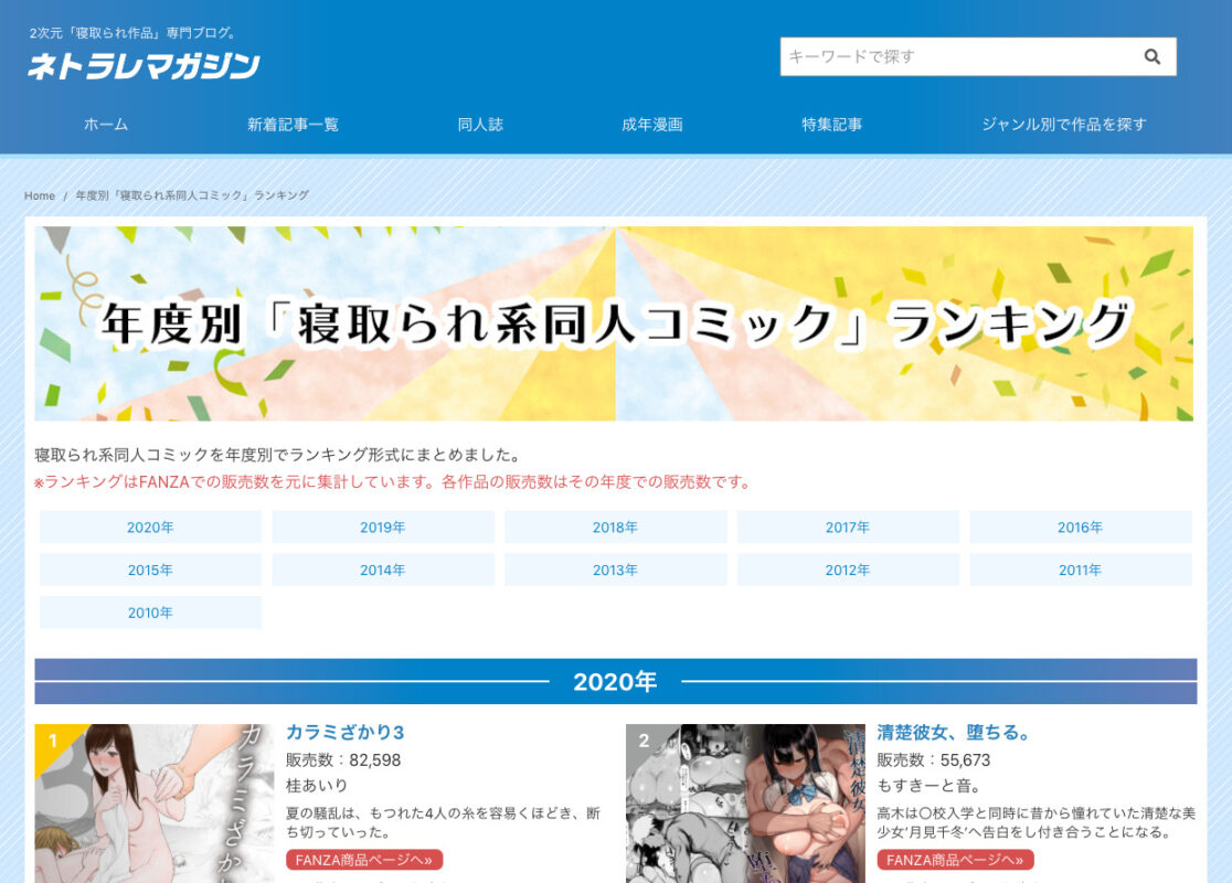 寝取られ系同人誌を年度別でランキング形式にまとめました。